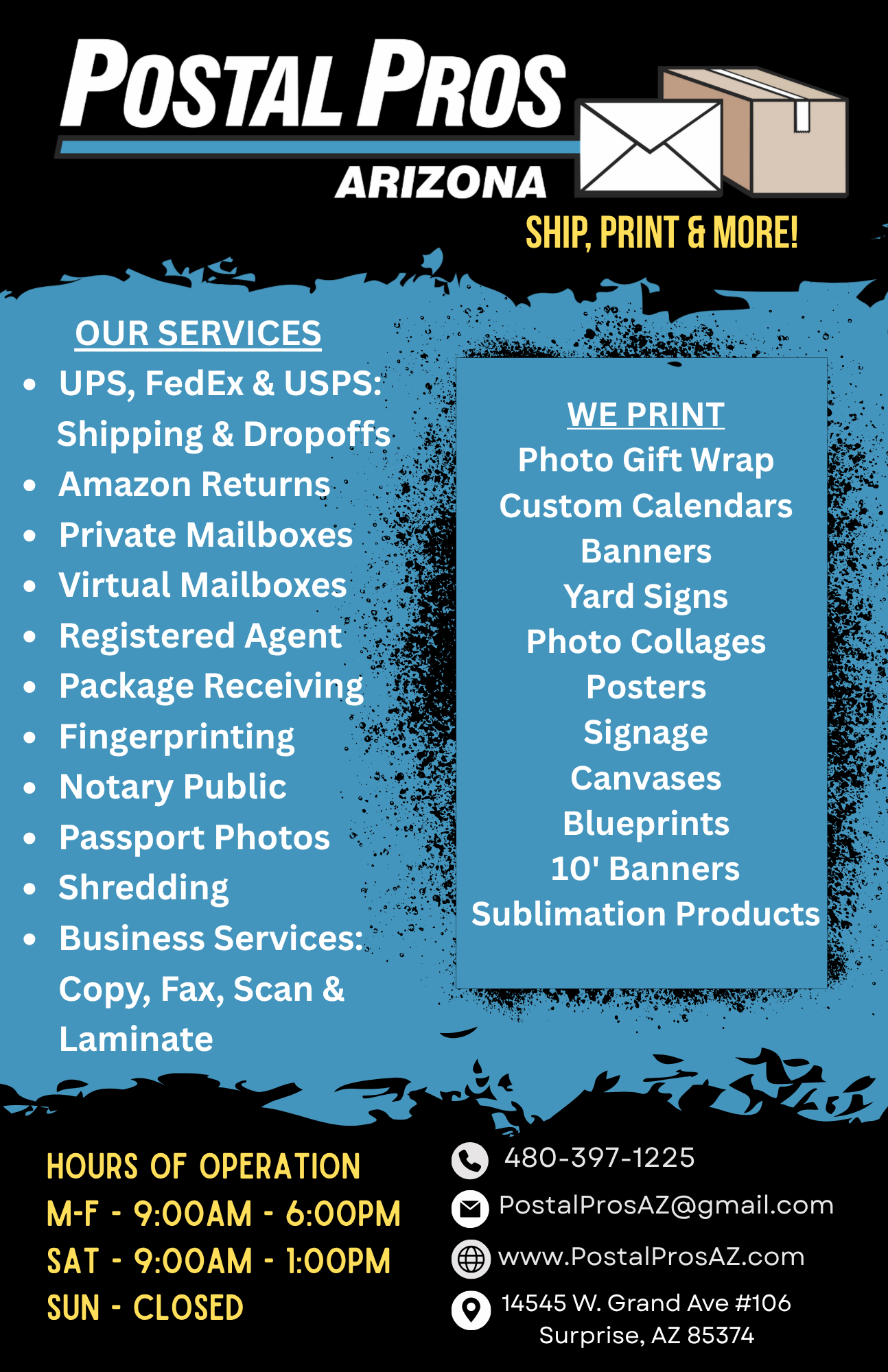 From Business Cards to Banners, Postal Pros AZ is your local print shop for everything you need. We print Signs, Photos, Yard Signs, Customized Sublimation Gifts, and Large-Format projects right here in store.