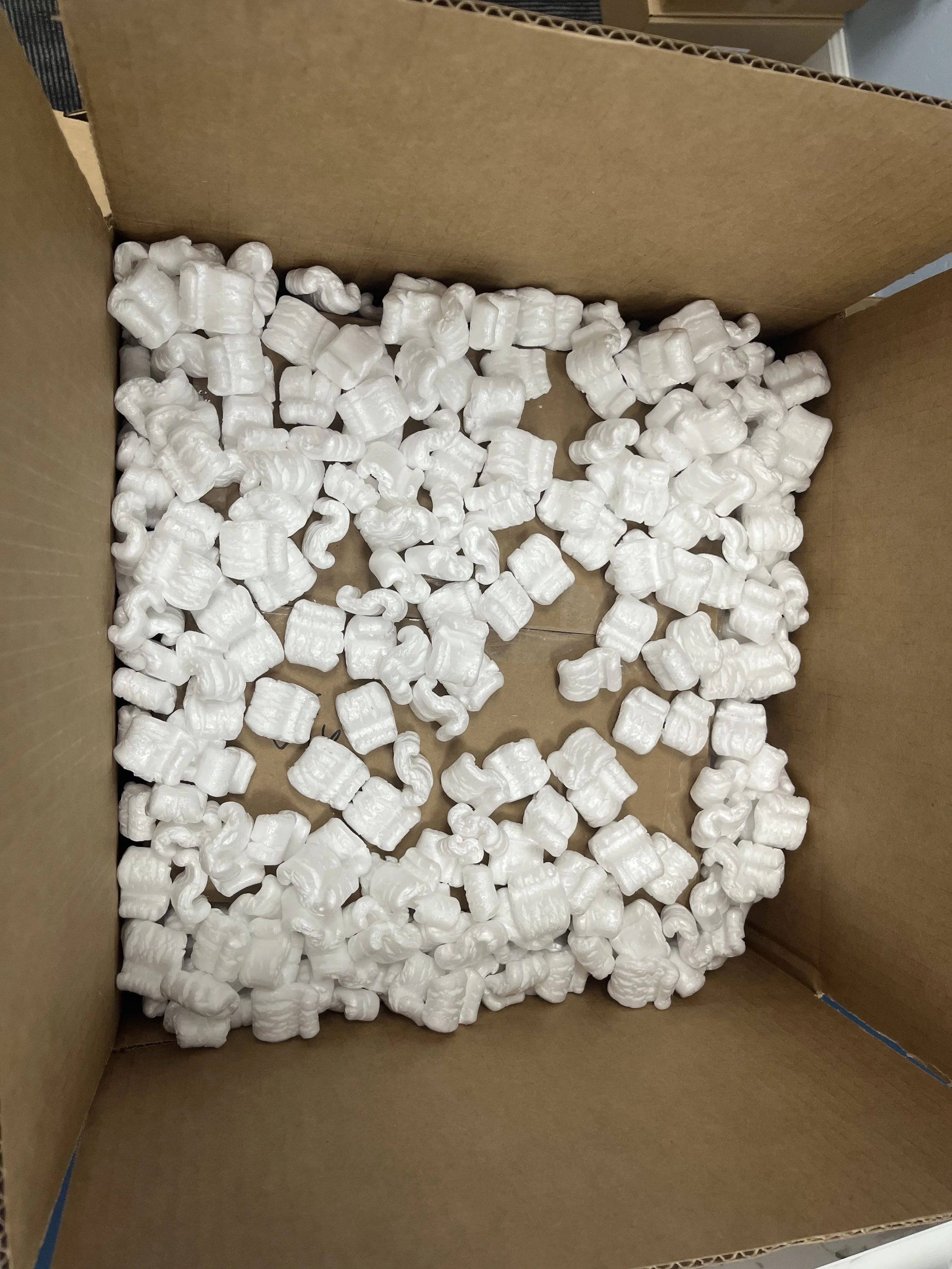 Double-Box Protection: Your wrapped item is placed into a sturdy inner box, which is then surrounded by 2" of loose-fill peanuts inside a second, larger box.
